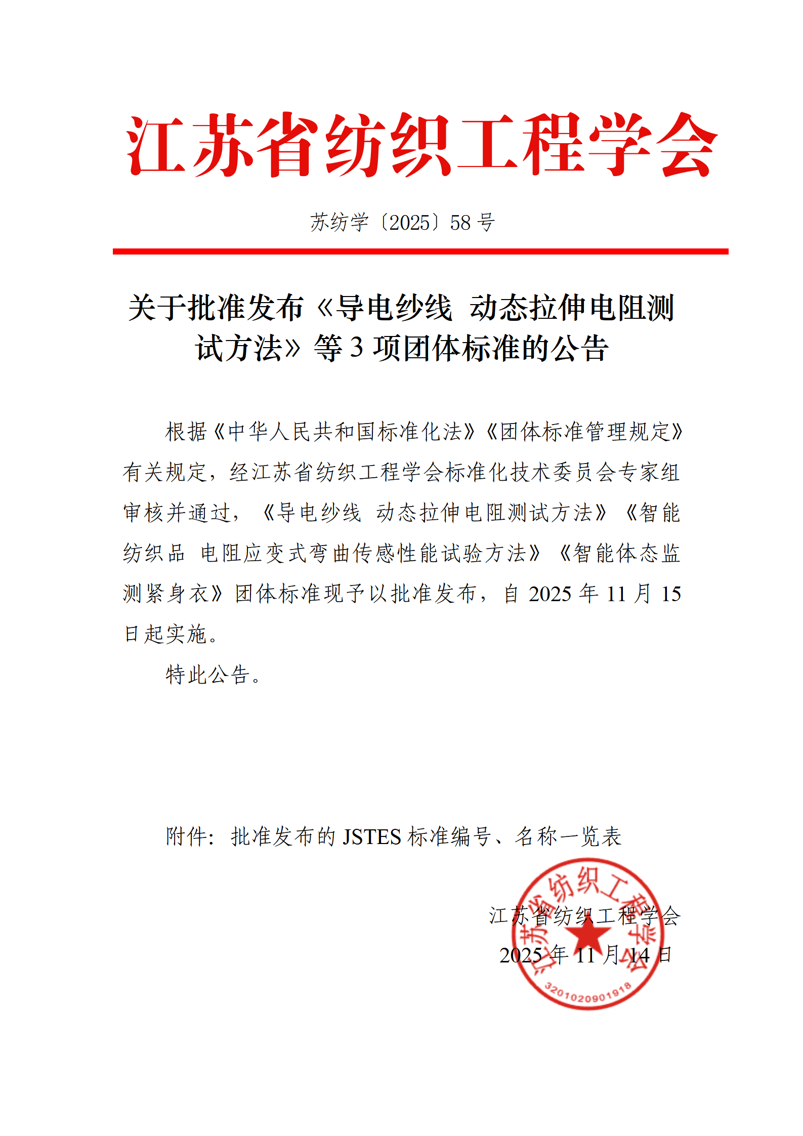 关于批准发布《导电纱线 动态拉伸电阻测试方法》等3项团体标准的公告