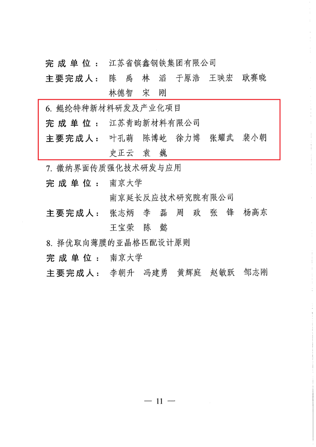 为广泛调动科技工作者的积极性和创造性,全面反映江苏科技发展成就,营造“尊重劳动、尊重知识、尊重人才、尊重创造”的良好氛围,激励广大科技工作者的科学热情和奉献精神推动实现高水平科技自立自强,113家省级学会组建8家省级学会联合体,联合组织开展了2023年度江苏省行业领域十大科技进展遴选工作,经提名、形式审查、初评、综合评审并向社会公示,确定62项十大科技进展。由江苏省纺织工程学会提名的江苏青昀新材料有限公司的“鲲纶特种新材料研发及产业化项目”入选“2023年度江苏省行业领域(新材料化工纺织领域)十大科技进展”。